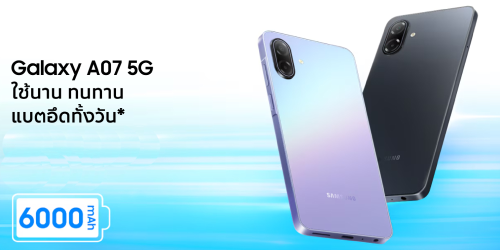 Galaxy A07 5G มาพร้อมแบตเตอรี่ขนาด 6,000mAh ใช้งานยาวนาน ดูหนังและสตรีมมิ่งได้ทั้งวันทั้งคืนโดยไม่ต้องชาร์จบ่อย